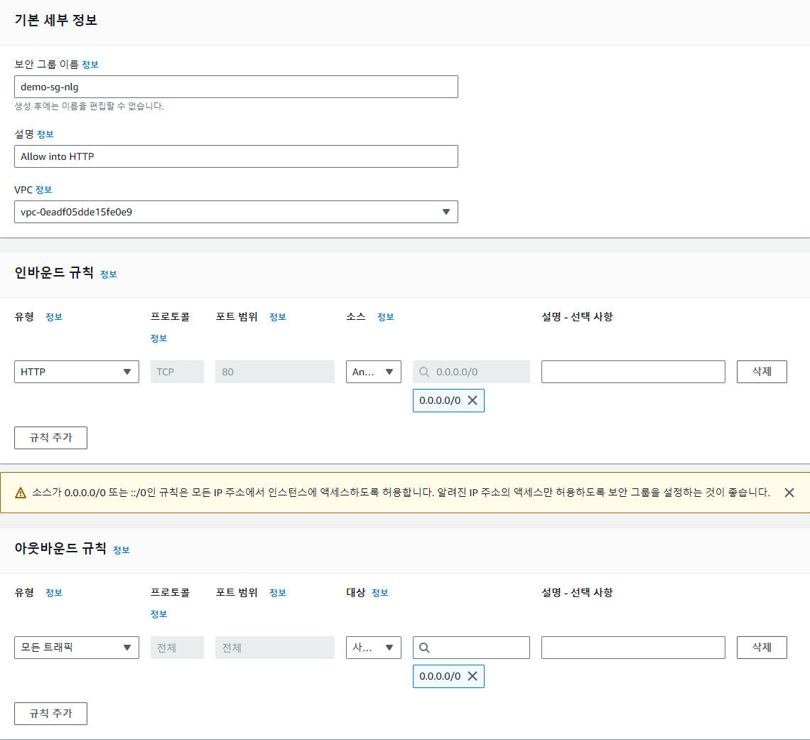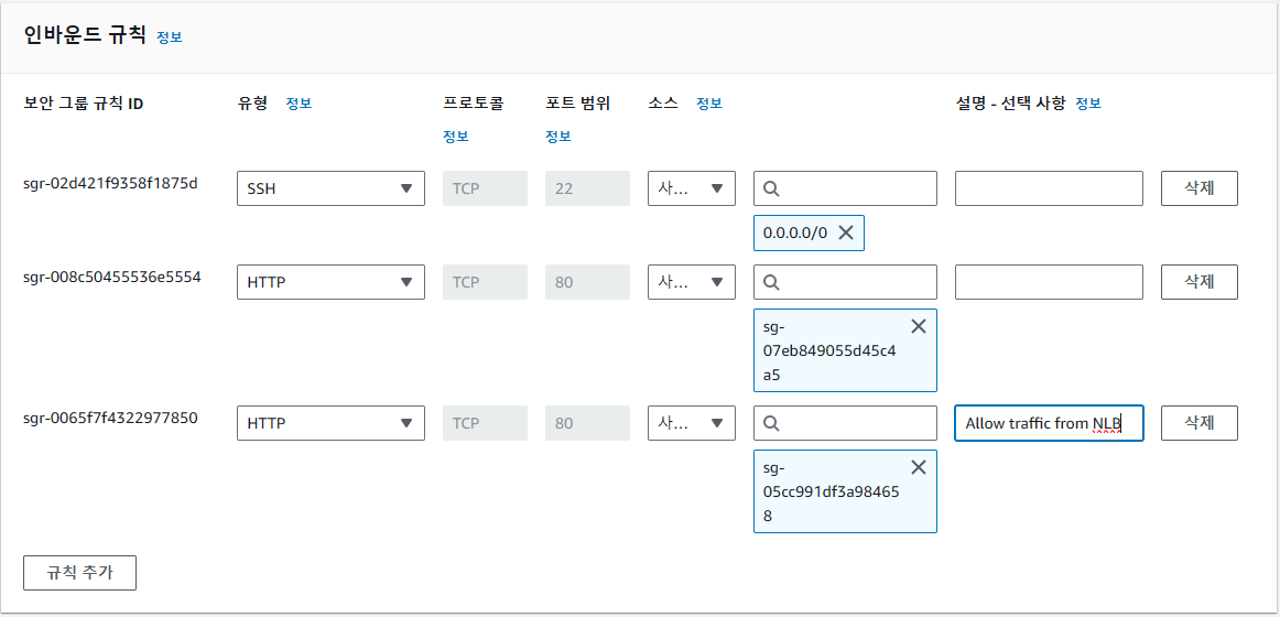 따라서 NLB로부터 HTTP 트래픽을 허용하는 규칙을 생성해야 한다.