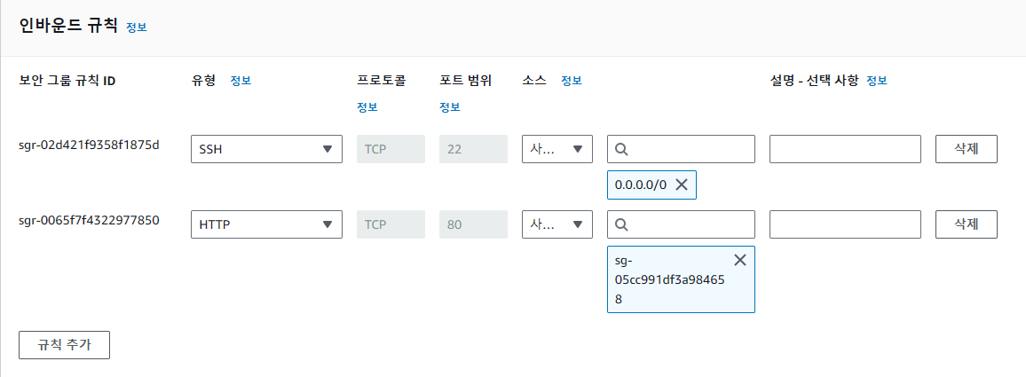 HTTP 요청만 받을 수 있도록 인바운드 규칙을 추가한다.