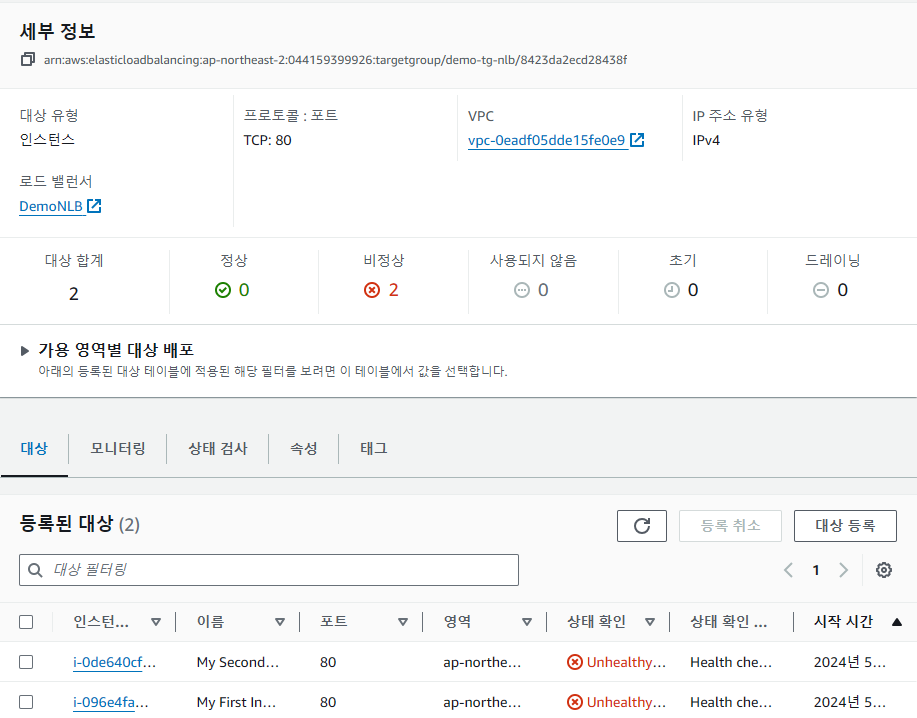 무슨 원인인지 파악하기 위해 대상 그룹의 Health Check 상태를 확인했더니 비정상이었다.